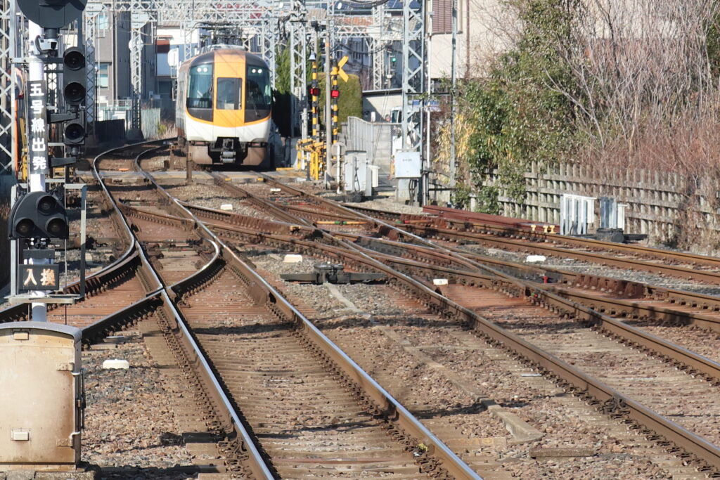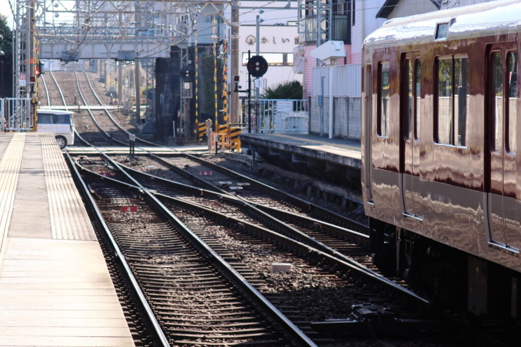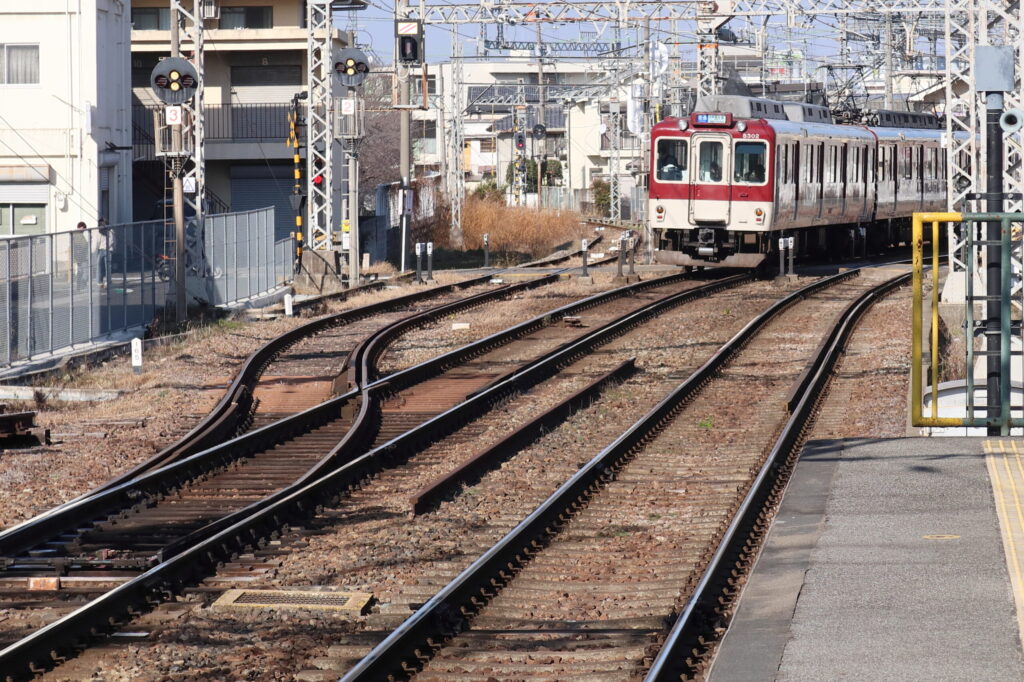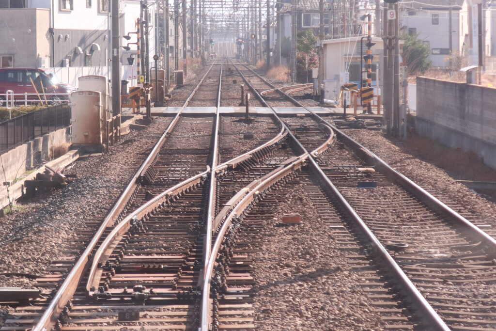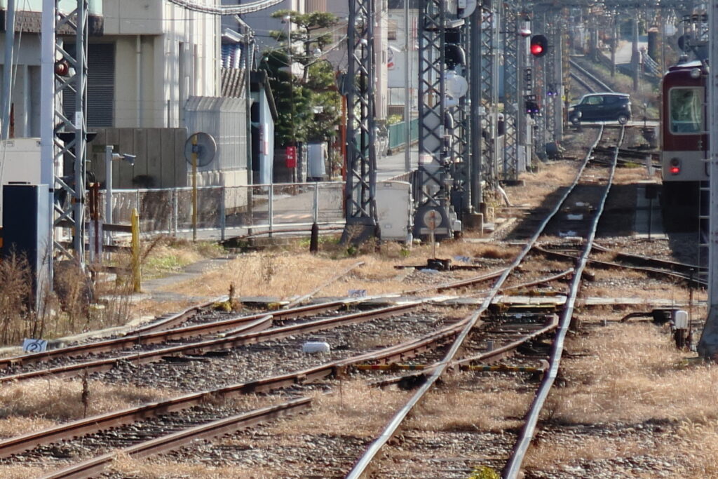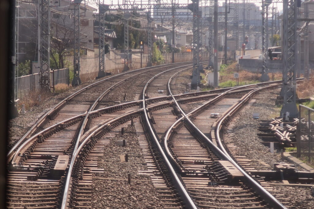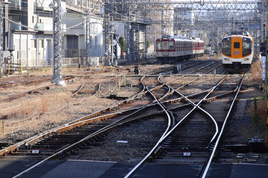 筒井方面で、橿原線と天理線は平面交差で合流します。交差部にはダブルスリップスイッチもあります。