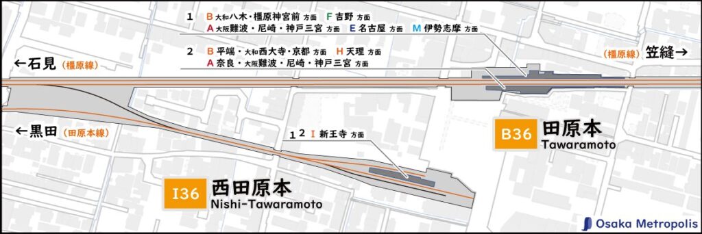 石見方に400mほど離れた場所に田原本線との連絡線があります。