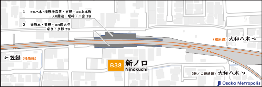 大和八木方面に大阪線との連絡線(新ノ口連絡線)があります。