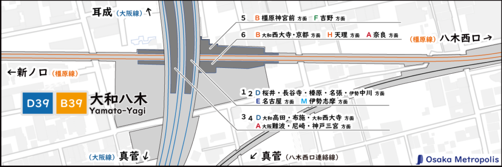 大和八木駅は大阪線・橿原線が乗り入れる、4面6線のホームです。十字の2層構造になっており、上階が大阪線の2面4線ホーム、下階が橿原線の2面2線ホームです。