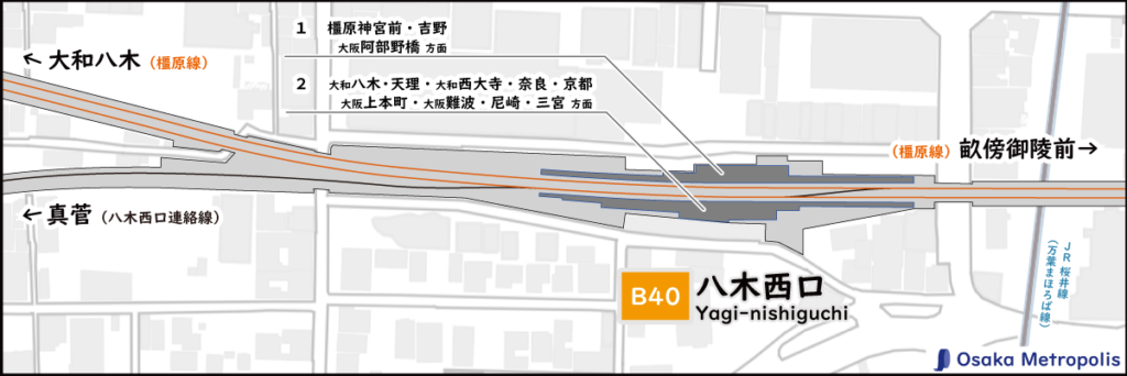 大和八木方面に大阪線との連絡線(八木西口連絡線)があります。またホーム畝傍御陵前よりに片渡り線があります。