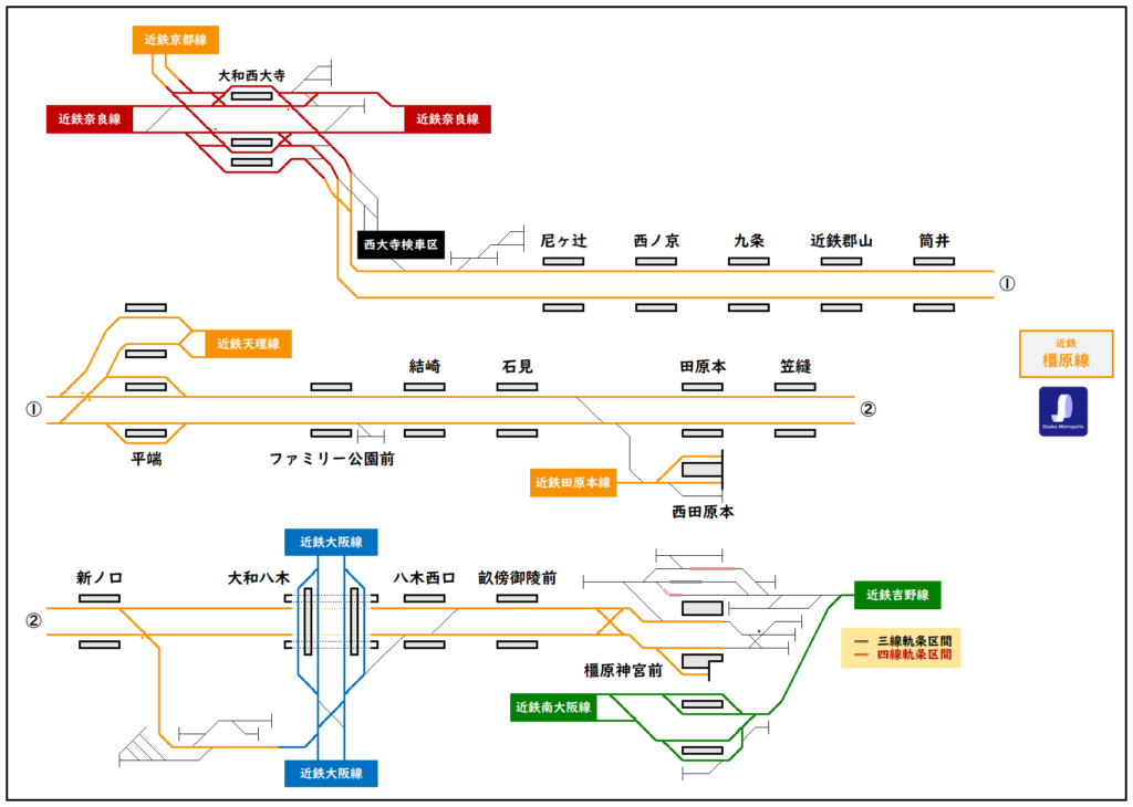 【2026年最新版】大和西大寺駅と大和八木駅、橿原神宮前駅を結ぶ「近鉄橿原線」の路線図・配線図を掲載。各駅の位置関係や線路配置をわかりやすく解説します。